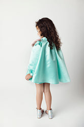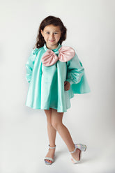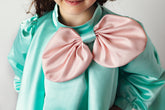 This dress speaks volumes. The silky satin mint fabric drapes beautifully, while the perfect powder pink bow adds an elegant touch. The tapered sleeve adds sophistication and joila! -The most perfect go to dress.